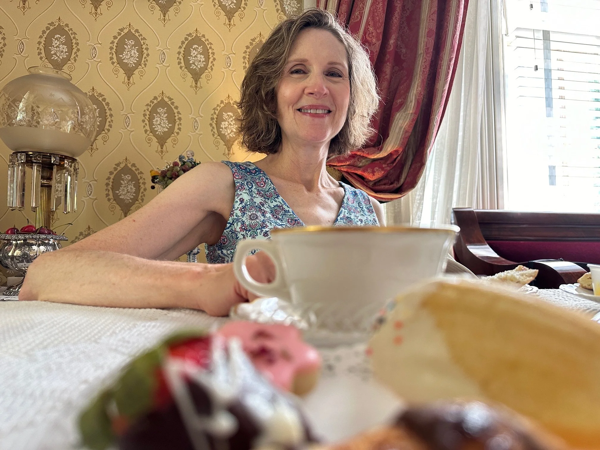 Welcome to Tea Week on Two Lane Touring. Jill enjoys tea and we often have afternoon tea. That was the theme of our reception as well, Afternoon Tea. Photos from which will be included on Thursday’s post. On our honeymoon I made a reservation for an afternoon tea (no dummy here!) at the historic Waveland Estate near Lexington, KY. The home was built by the grandnephew of Daniel Boone in 1848 and is now a state historic site. We were there for their “Tea Tuesday” with our several hosts in period costume. There were two teas served and the story behind them is tomorrow’s post. The first tea was a darjeeling and the second was a mint dessert tea. And three courses of small bites like chicken salad on a croissant, tiny quiche, ham biscuit, and four desserts on the last plate. They even accommodated my “no cheese mandate.” After the tea we had a guided tour of the house and then walked the grounds and gardens. Nice afternoon.