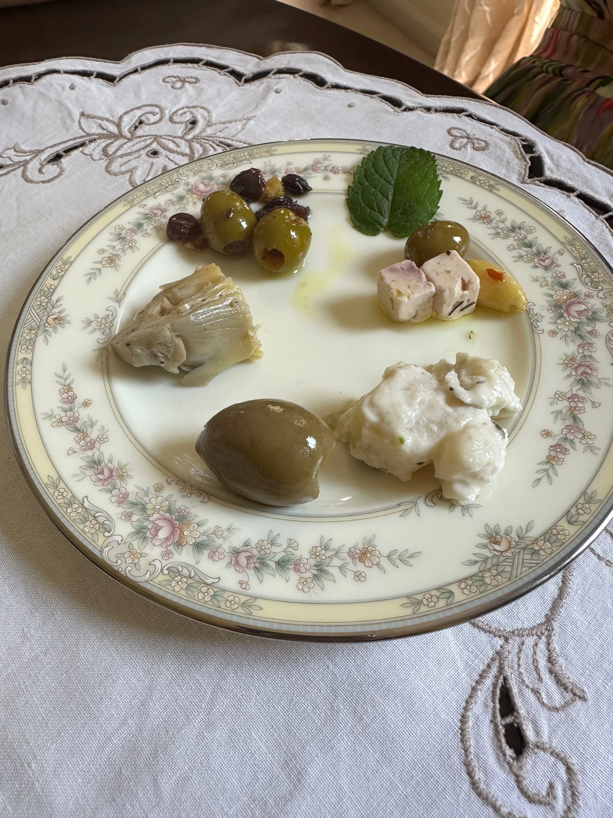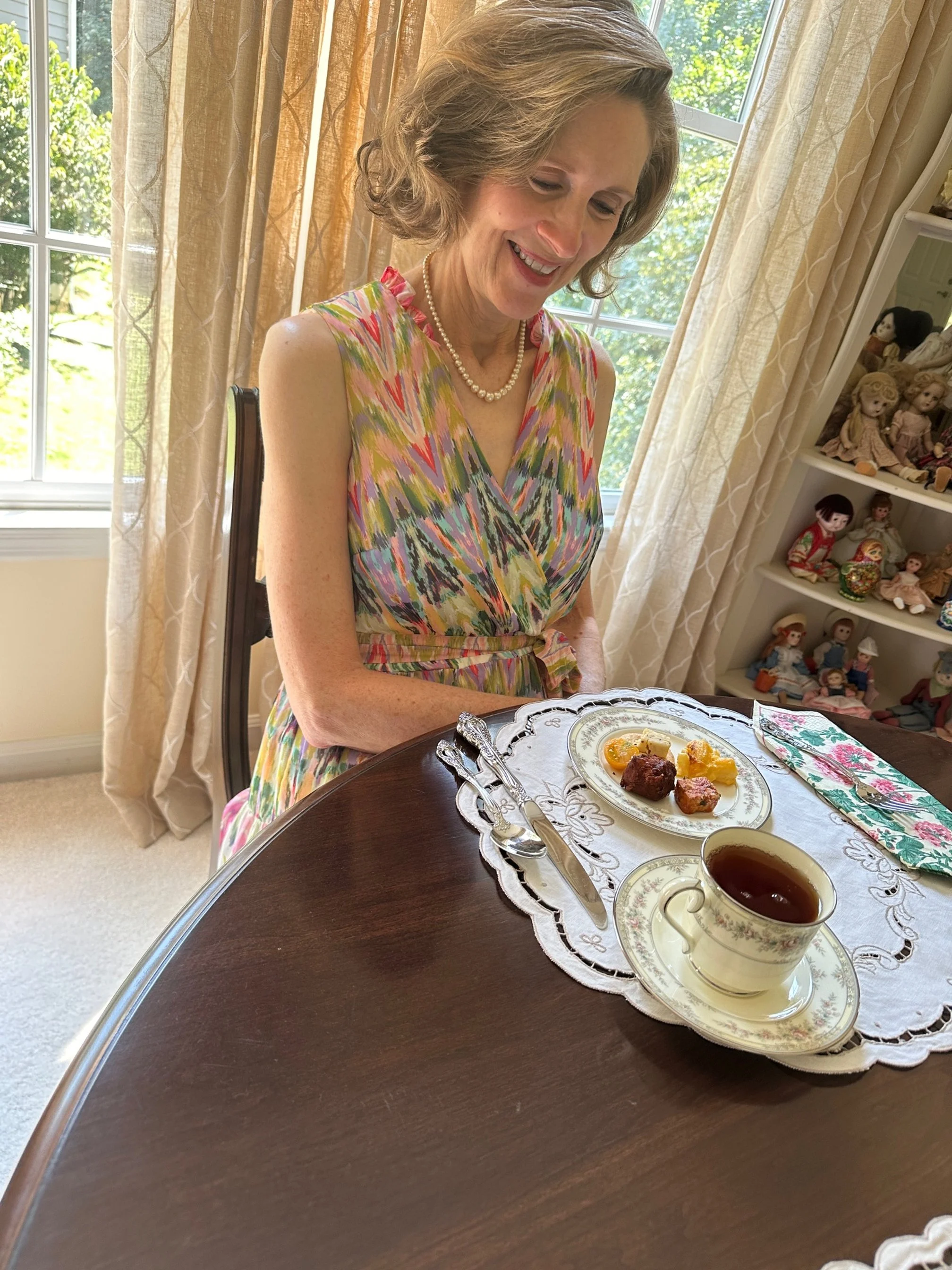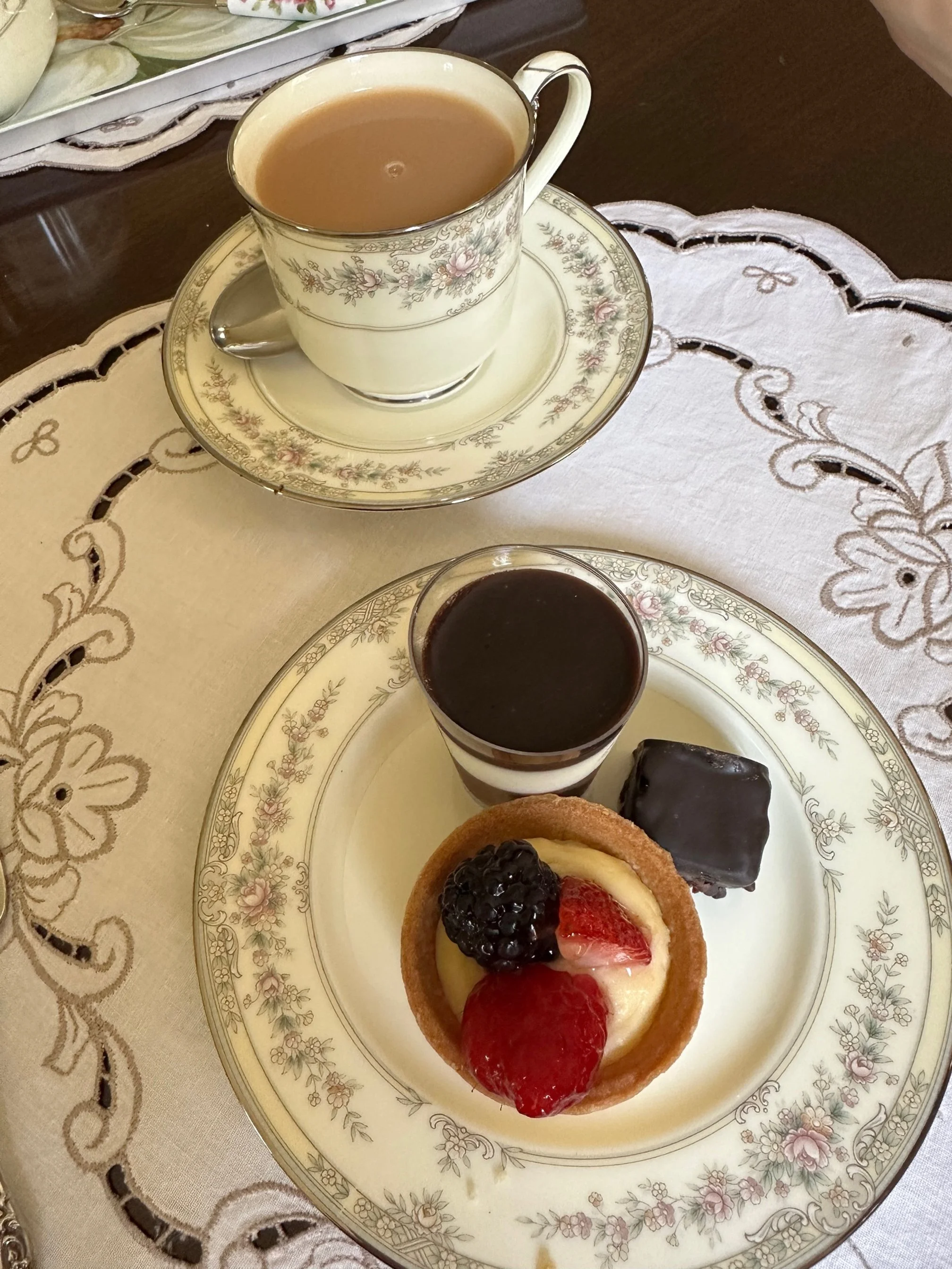 An afternoon tea at home. Jill celebrated a birthday a short time ago and I served her an afternoon tea in the style (sort of) that we enjoyed at Waveland in Kentucky (Monday’s post). I brewed two teas from Elmwood Inn (yesterday’s post) along with an assortment of small bites on nice china. Not to worry, I bought most of the “small bites” at the food bar at Whole Foods so it was all safe and fun. A lovely afternoon experience with a touch of elegance..