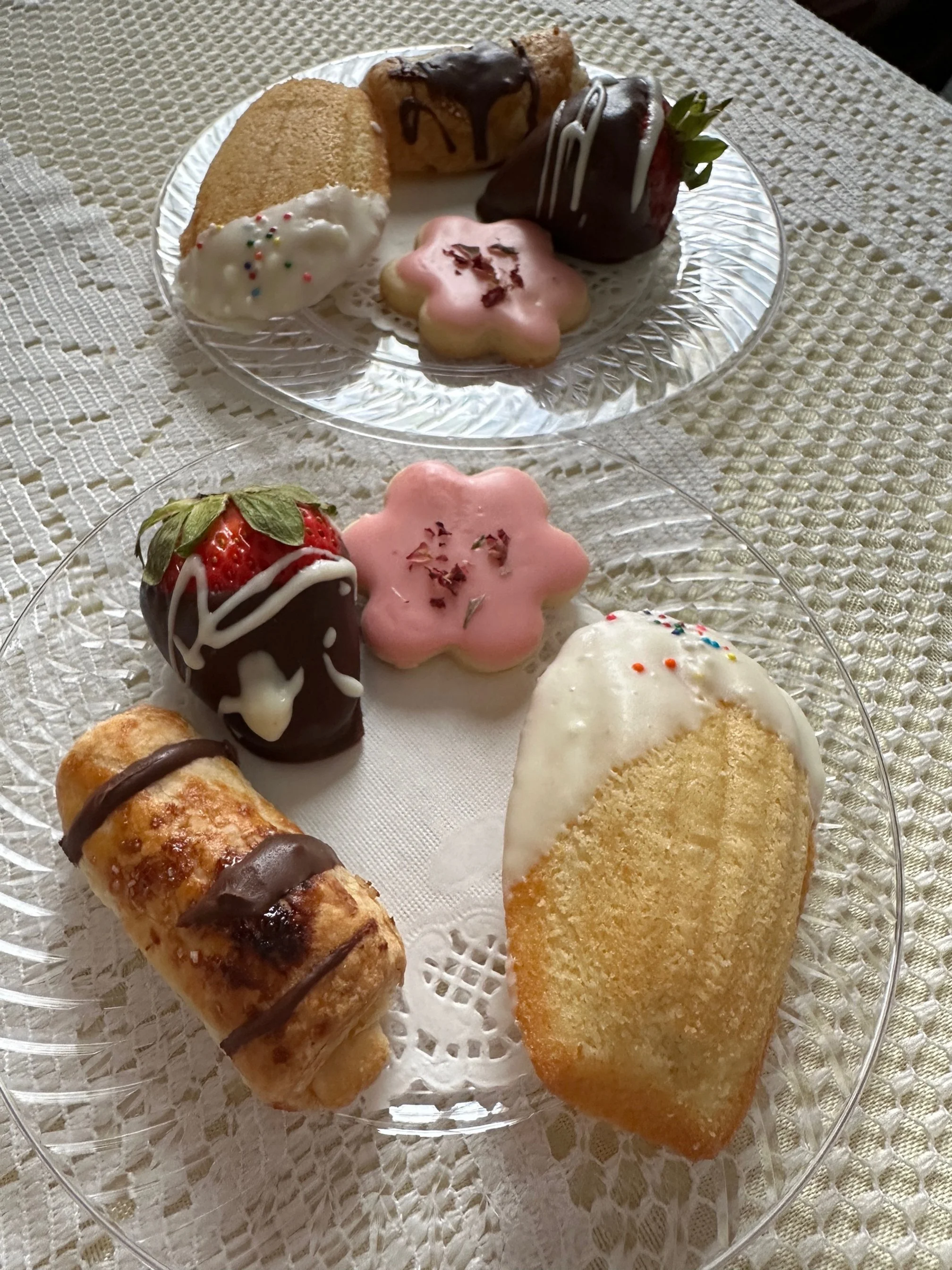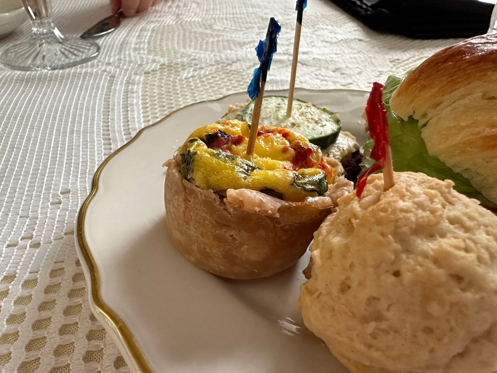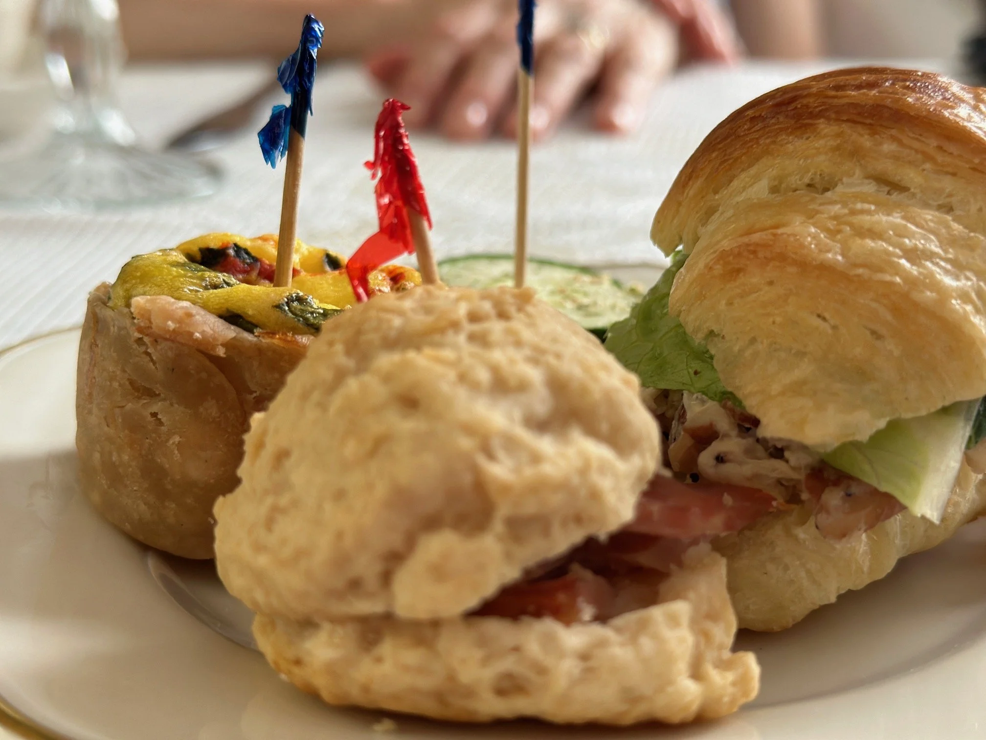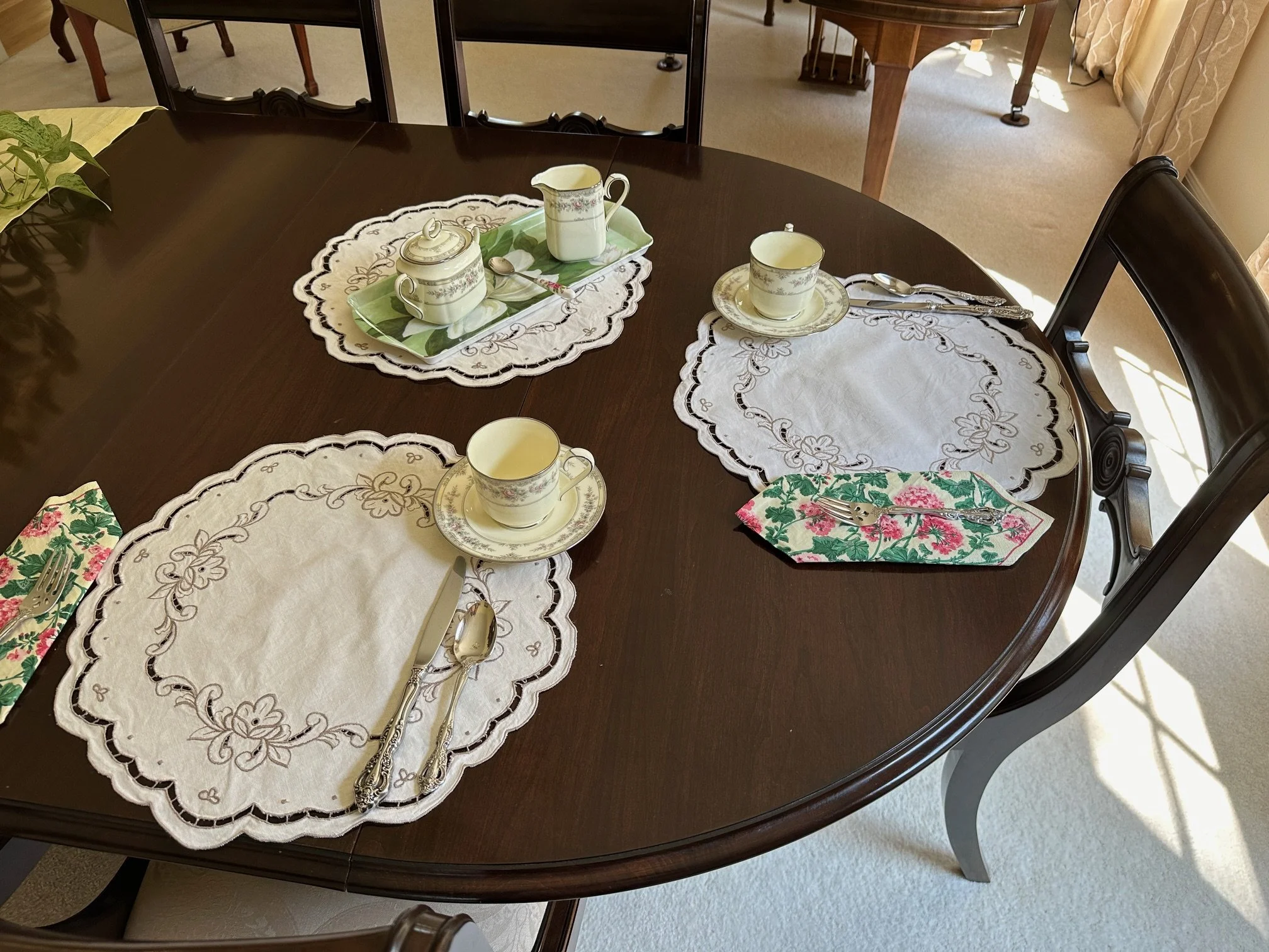 An afternoon tea at home. Jill celebrated a birthday a short time ago and I served her an afternoon tea in the style (sort of) that we enjoyed at Waveland in Kentucky (Monday’s post). I brewed two teas from Elmwood Inn (yesterday’s post) along with an assortment of small bites on nice china. Not to worry, I bought most of the “small bites” at the food bar at Whole Foods so it was all safe and fun. A lovely afternoon experience with a touch of elegance..